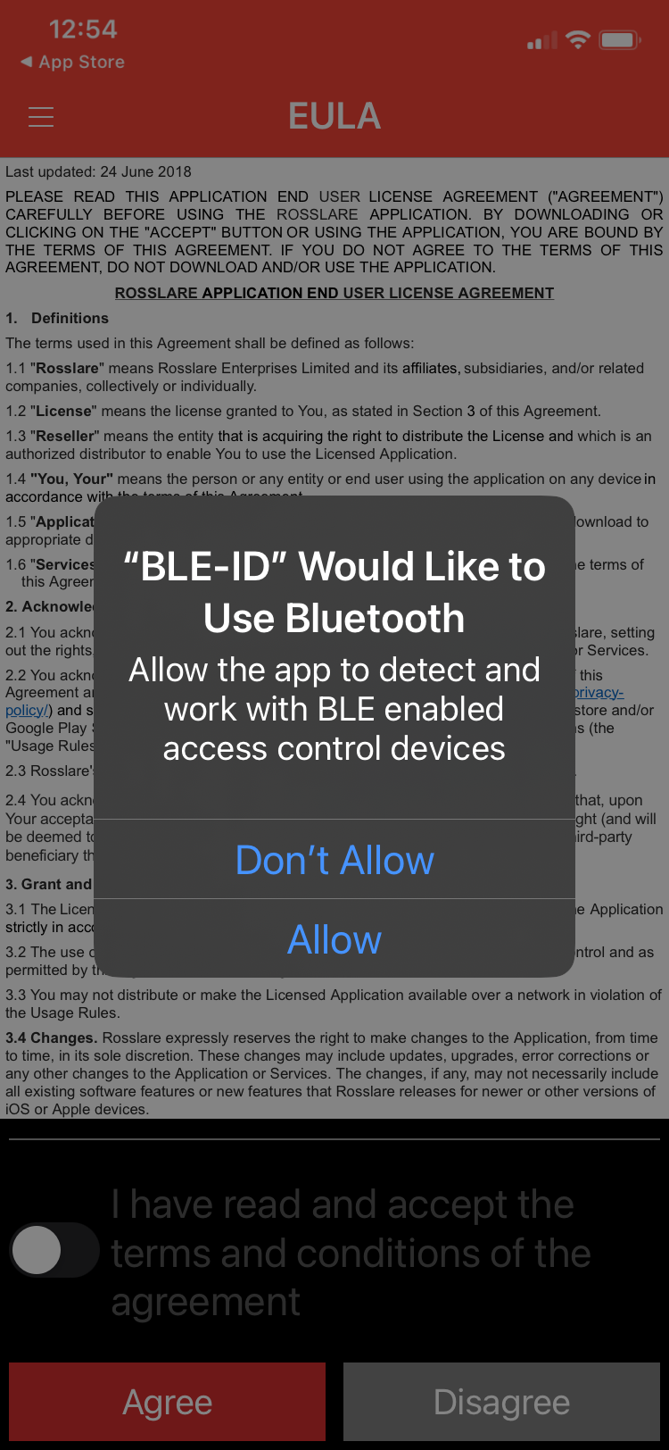 2. Allow Bluetooth access to the app, and agree to the Terms and Conditions on the BLE ID App
